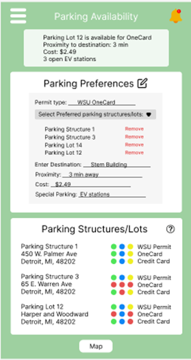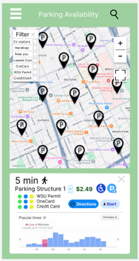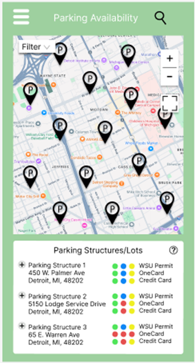 My approach focused on incorporating intuitive design elements, and improved mobile accessibility. By streamlining the process, the new interface aimed to reduce frustration and improve the overall parking experience for Wayne State students, faculty, and visitors. Through careful analysis, design, implementation, and evaluation, I successfully developed a more user-friendly and reliable parking availability system that contributes to a smoother, less stressful parking experience for the campus community.