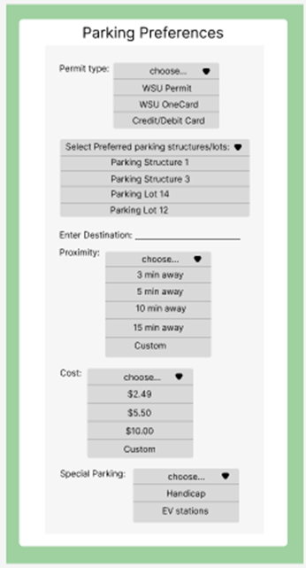 The parking preferences display the user permit type, preferred parking structure/lot, as well as preferred cost, proximity, and special parking. The user is able to change these preferences by clicking the edit icon next to the parking preferences title. A more detailed figure of this functionality will be shown in the appendices. The user can also remove a parking structure/lot from preferences by clicking remove. This parking preferences feature reflects a deep understanding of user-specific needs, such as proximity, permit type, and cost. Allowing users to customize their preferences made this prototype more adaptable to varied use cases and enhanced user satisfaction.