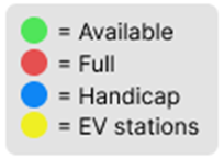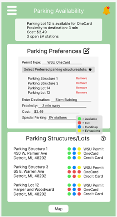 The parking structure/lots section shows a list of parking structures located around campus. Next to it is the color-coded schema indicating green for available, red for full, blue for handicapped, and yellow for EV stations. Each of these dots is next to the preferred parking types, such as WSU Permit, OneCard, and credit card. The parking structure/list also has a question mark icon circle in the top left corner, which explains the color-coding schema and, which is shown in the appendices. The map button at the bottom of the screen takes the user to the interactive map page. Overall, these color-coded indicators for handicap, and EV stations provide quick, intuitive understanding of parking statuses. This visual aid aligns with user expectations for clear, accessible information and reduces cognitive load.