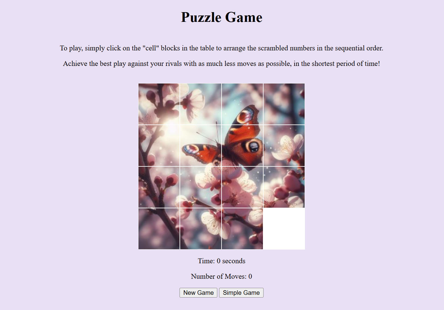 I created an interactive puzzle game using HTML, CSS, and JavaScript, designed to challenge users while keeping them engaged. The game features a timer and number of moves counter, encouraging players to improve their performance by using the least amount of moves in the shortest period of time with each attempt. Through dynamic animations, smooth transitions, and an intuitive interface, I ensured that the game provides an enjoyable user experience. JavaScript handles the game logic, and managing the countdown timer to add an element of urgency. This project showcases my ability to combine functionality with engaging design, creating an interactive and immersive web-based game.